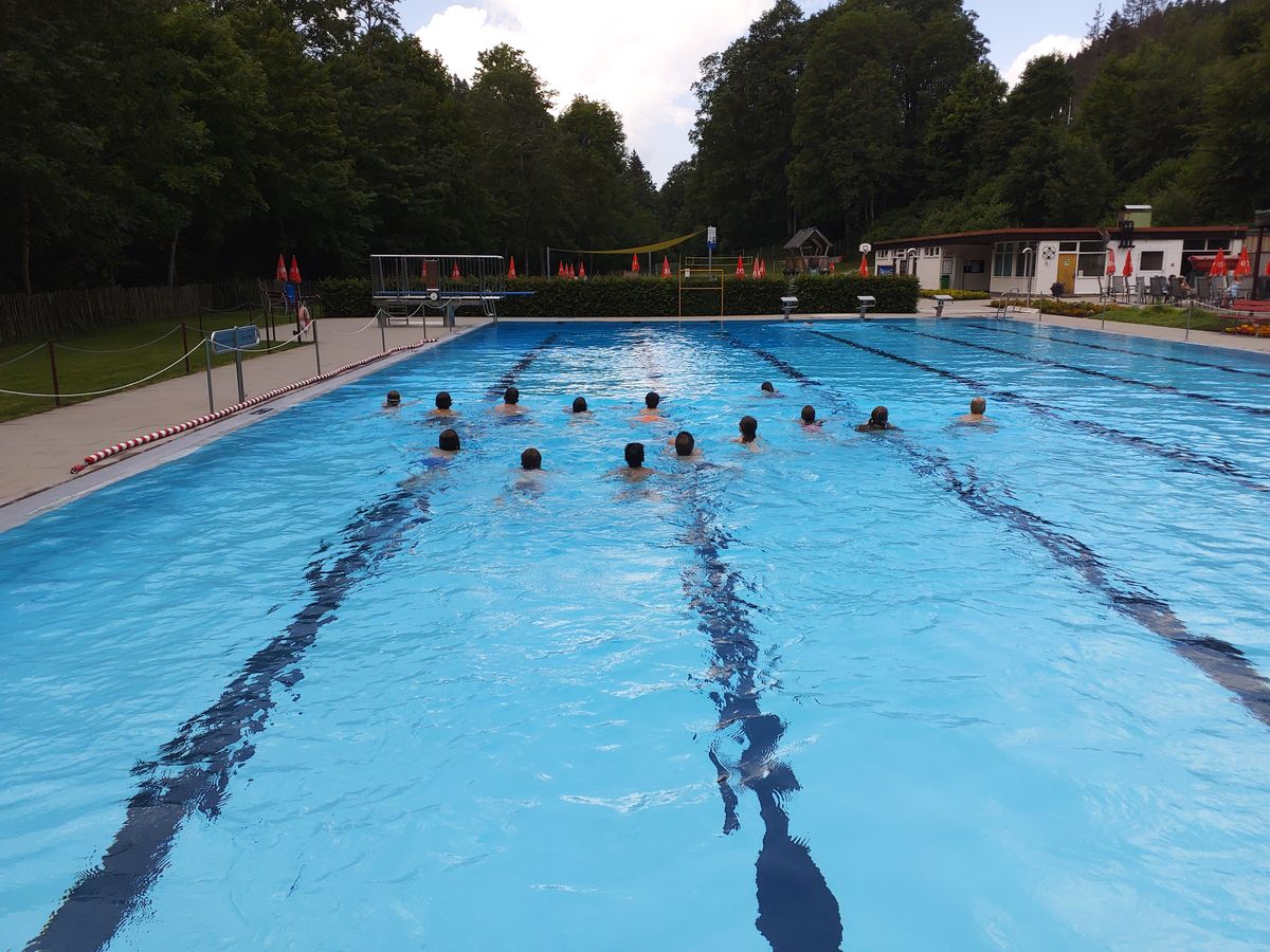 Seit den Pfingstferien gehen die 2. und 3. KlässlerInnen wöchentlich zwei Stunden in das Freibad Lenzkirch. Aufgeteilt in zwei Gruppen werden sie von  der Schwimmmeisterin Angela Fiedler, dem Schwimmmeister Timo Schweizer und den Lehrkräften der Schule unterrichtet. Mit viel Engagement und Herzblut arbeiten die beiden mit den Gruppen an der richtigen Technik, dem Tauchen, Springen und bringen Ihnen das Kraulen bei.